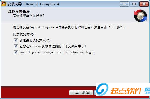 这一步安装向导要我们选择安装Beyond Compare期间安装向导要执行的附加任务,分别是创建桌面图标、包含在Windows资源管理器的上下文菜单中和开机自动启动Beyond Compar,如果不需要执行,将勾选取消即可。点击[下一步]继续安装;
