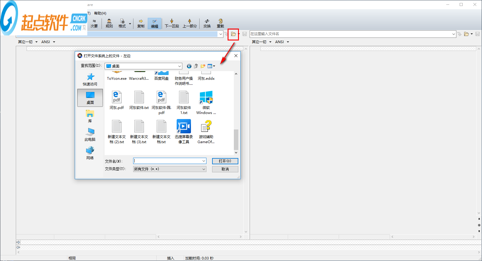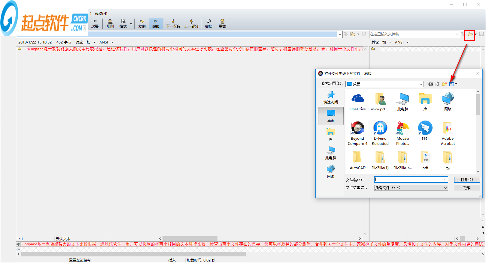 4、用户点击左侧窗口“在这里输入文件夹”一栏的右侧的【文件夹】图标,在呼出的“打开文件系统上的文件-左边”窗口,我们在其中找到并选择要比较的文本。