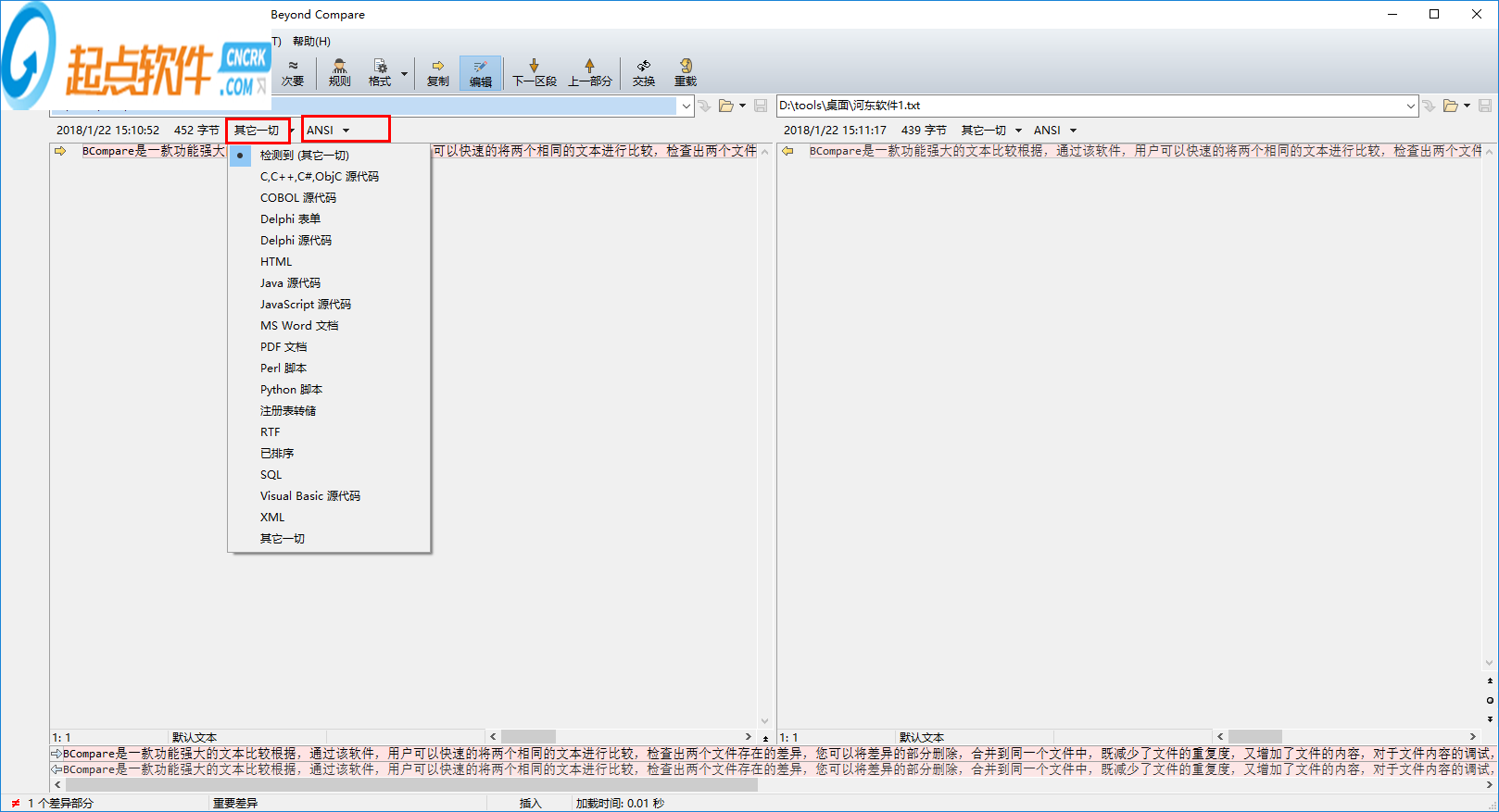 1.全面文件比较支持,几乎可比较任何类型的文件;便携安装,不写注册表,方便使用。2.支持比较普通文本、代码、十六进制文件、注册表、mp3、图片、版本信息、文件夹、压缩包、整个驱动器、FTP网站等。
