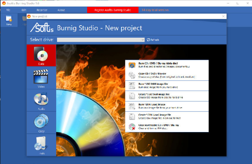 Asoftis Burning Studio是一款可以刻录视频的软件,你可以将自己的视频刻录到DVD使用,可以将音频刻录到CD使用,内置详细的引导步骤,启动软件就可以看到新项目设计的方案,你可以在软件的功能界面选择刻录类型,支持数据、视频、音频、复制等四个主要的光盘操作功能,如果你点击data就是设计设局光盘,如果你点击video就是建立视频光盘,另外这款Asoftis Burning Studio软件内置注册程序,可以轻松对软件授权!
