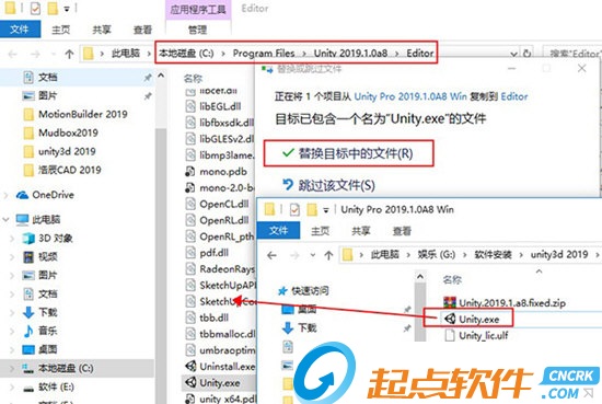 7、将破解补丁“Unity.exe”复制到“C:\Program Files\Unity 2019.1.0a8\Editor”目录下替换原文件