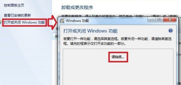 7、程序和功能——打开或关闭Windows功能(会加载,请稍候)。