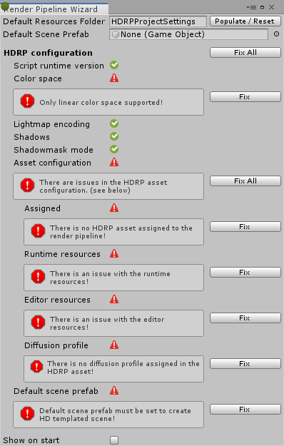 渲染管线向导会帮助你配置项目设置,以便在使用HDRP时正常工作。它会高亮不正确的配置部分,提供Fix按钮来校正设置,你也可以在此设置新的自定义场景。