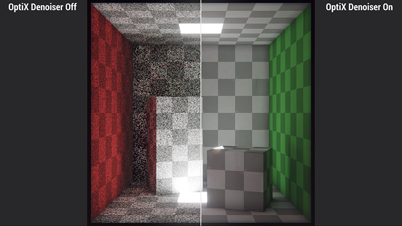 Optix AI Denoiser是一种基于深度学习的降噪器,它使用路径跟踪图像库进行训练。这是对过滤选项的重大改进,在样本数量较少的情况下,它可以灵活应变漏光和模糊情况。它可以结合其它过滤器,实现更加平滑的光照贴图。