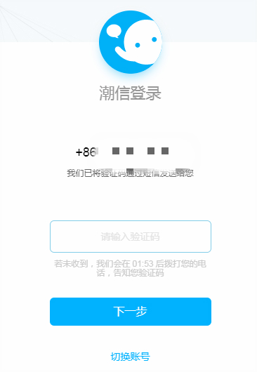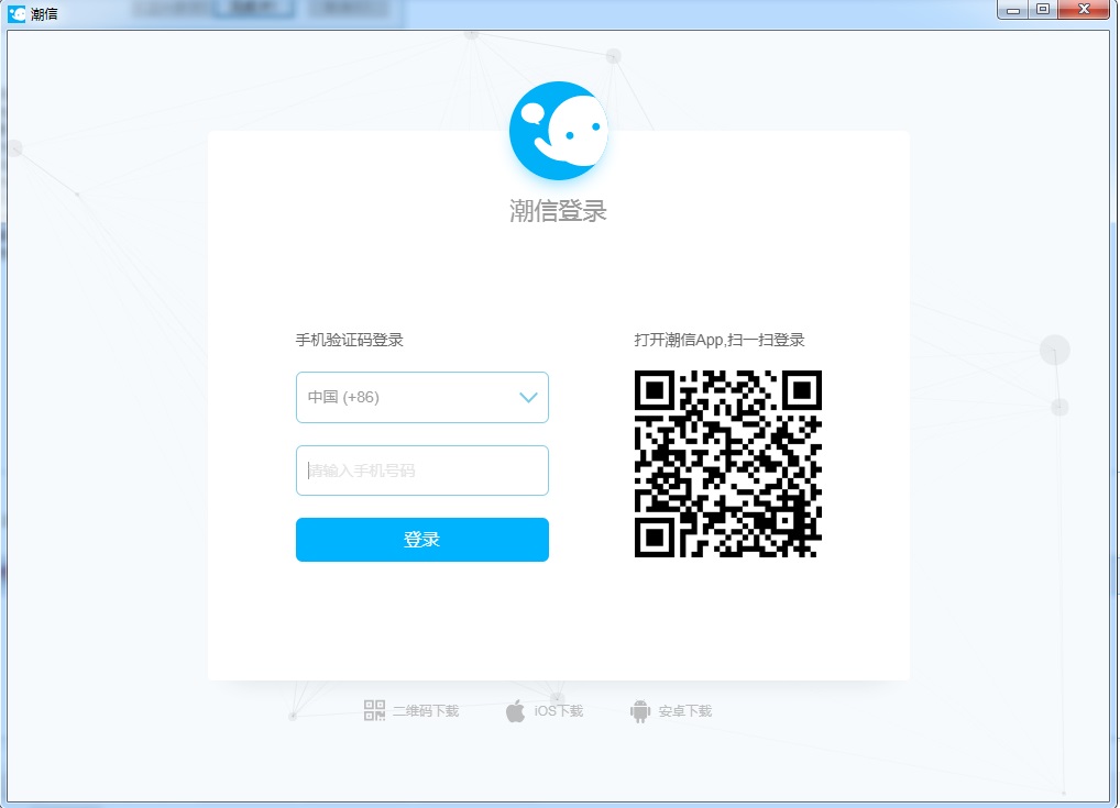 1.双击打开潮信电脑版,提示登录的界面,2.未注册用可以选择手机验证登录,已安装用户可以选择潮信app扫一扫登录。