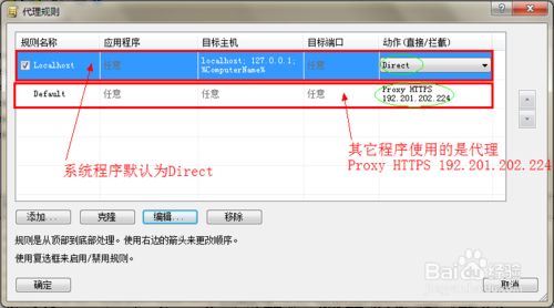 共有两条代理规则。一条是"localhost",另外一条是"Default"。Localhost规则主要是解决某些游戏连接本地服务的时候不使用代理服务器来进行连接,要不会连接不了游戏服务器。Default是默认的,在其它规则以外的都会使用Default规则进行代理,规则动作栏共有三个选择:1、Proxy HTTP 111.1.32.21:使用111.1.32.21进行http代理。
