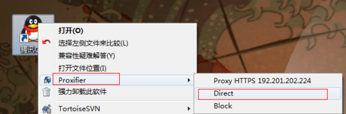 仍以QQ为例,如图在桌面对QQ图标点击右键,在菜单栏中依次选择“Proxifier”-“Direct”,然后就以Direct方式打开了QQ,实现了不使用代理上网。
