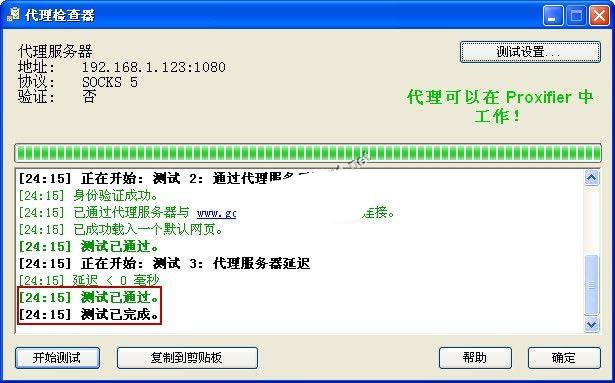 6) 在弹出“代理检查器”对话框中,将显示测试信息。