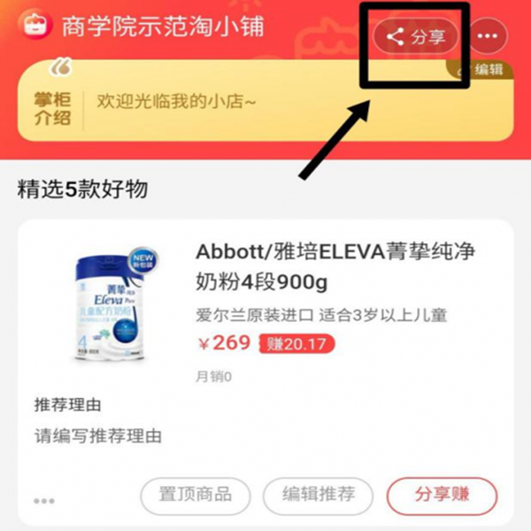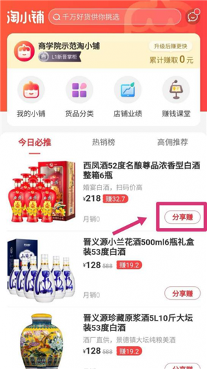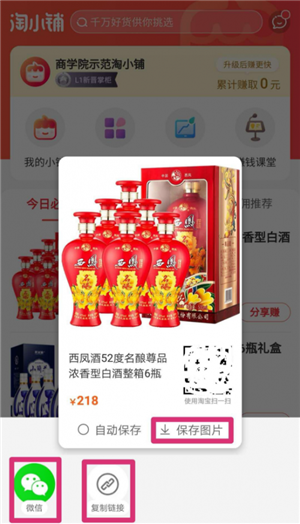 进入淘小铺APP 后,选择感兴趣的商品,直接点击“分享赚”按钮即可保存二维码或者复制链接进行分享,好友下单,你即可获得收益, 如下图。