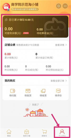 1、进入淘小铺APP 后,点击右下角“个人中心”,如图示进入设置中心。