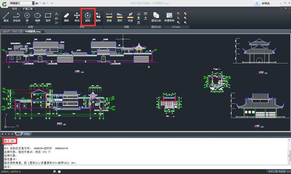 软件界面上方有旋转功能,点击之后,选择需要旋转的区域就可以了,也可以在命令行输入旋转命令:RO,如图: