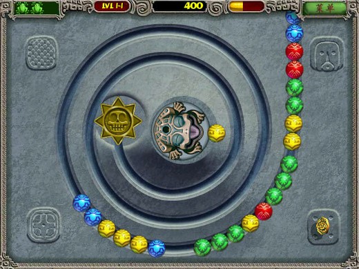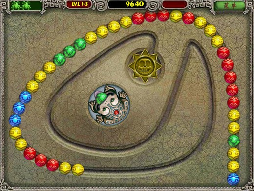 印加古青蛙祖玛,主角是。。石头青蛙固定在中央,周围是一圈圈轨道,各色彩珠顺着轨道向青蛙滚来~~