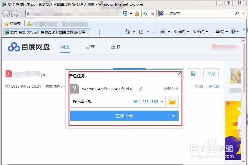 那么我们再看下IE浏览器支不支持,我们在IE浏览器中打开百度网盘资源,点击下载后会提示下载链接已经生成,请点击下载,我们点击下载后就会直接使用迅雷下载百度网站资源了,所以IE浏览器是支持的。