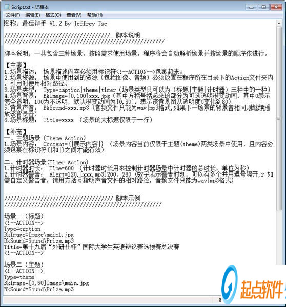 最佳辩手计时工具采用脚本编写,如需修改其文字内容,就要去修改脚本。场景脚本存放在程序同目录下的Action文件夹内,文件名为Script.txt,示例一共包含三种场景,按照需求使用场景,程序将会自动解析场景并按场景的顺序依进行。