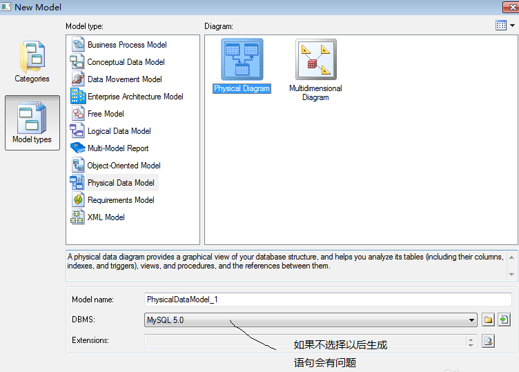 首页要建立模型,只有建立模型以后才能建立表格,才能进行以后的操作。选择“File”然后选择第一项内容“New Model”,弹出新页面,在页面中的“Model name”填写自己的名称,在下面的“DBMS”中选择你要生成的数据库类型。建议在这里选好后,以后生成的语句会好一些