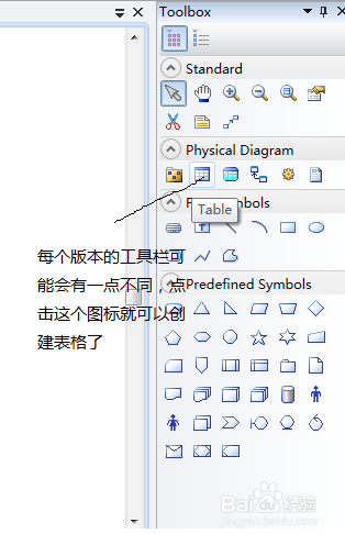 现在模型已经建立好了,让我们来开始建表吧。首先在右侧工具栏中选择建表工具。其中在“Physical Diagram”中选择有表格的这个,也就是下图标记的这个,把鼠标放上去显示Table就可以了。点击以后在中间的地方选择放置的位置。