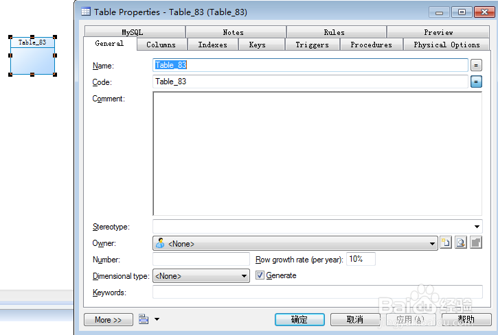 在中间放置好后,双击就能修改表名称和添加字段了。在图的左边就是刚才放置的表格,然后双击就出现后侧的对话框了。这个时候name是给自己在软件中查询看到的名称,Code是当前的表名,建议命名的时候有一定的规律。比如系统以sys_开头,正常表以t_开头好一些。comment是导入数据库的表的名称注释,建议要填写。为了以后方便使用。