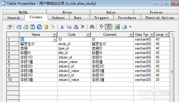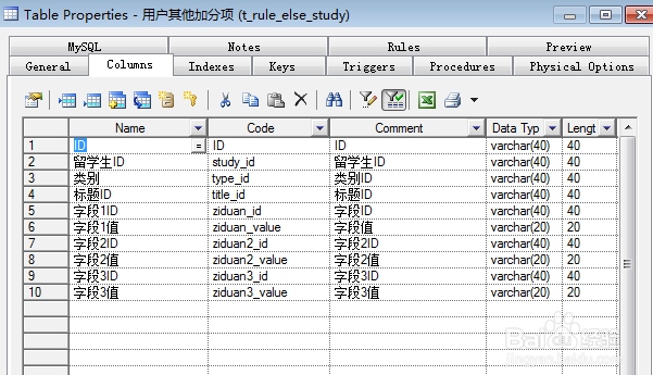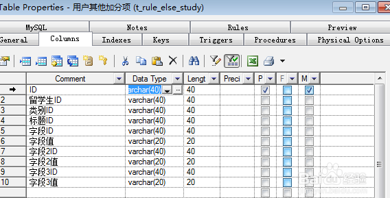 Date Type是设置字段的类型,其中varchar(40)是字符串型,int是数字型。在Length是字段的长度,如果是主键的话Piamary和Mandatory这两个是要选中的,一个标示是主键,另一个是标示不能为空。
