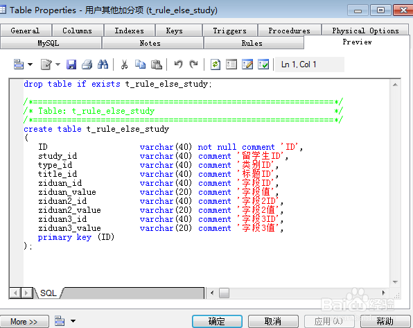 这样基础的建表就已经完成了,在表名上选择右键,选择“SQL Preview”就能看到SQL代码了。