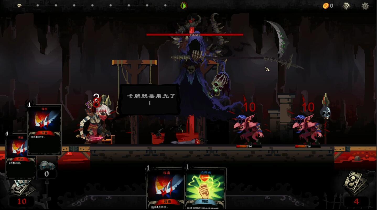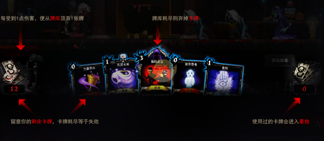 本作和其余卡牌游戏不同的是将自己的牌库和血量结合在了一起,掉血会移除牌库里的卡牌,牌库没牌不会重新洗牌,只能等死了。