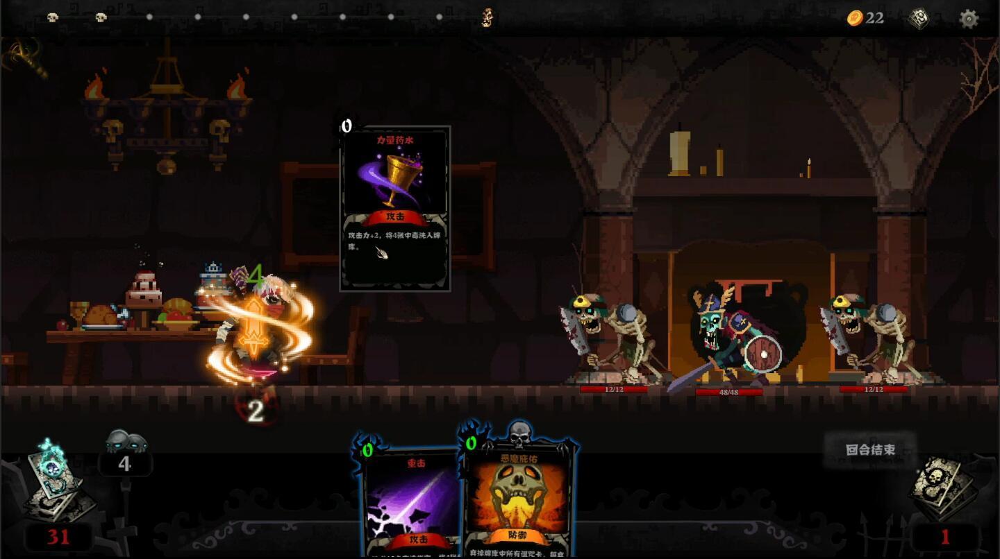 《Blood Card》这是一款roguelike卡牌游戏,在杀戮尖塔之上做了极其优秀的创新。游戏中取消了血量的概念,扣血改为将等额卡牌送入墓地。这不仅影响到了对诅咒牌的看法(如果你玩法得当,诅咒牌可以看作在增加生命),还产生了围绕墓地的新流派(用送入墓地时会产生特殊效果的卡牌为核心)。同时,死神加入(游戏中战斗开始若干回合后会有每回合无差别全体攻击的死神出现)不仅成为了玩家击败敌人的帮手,还增加了新的获胜条件(弑神)。