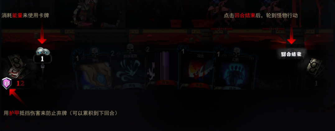 相同的是使用卡牌都会消耗能量,能量耗尽可以点击回合结束。