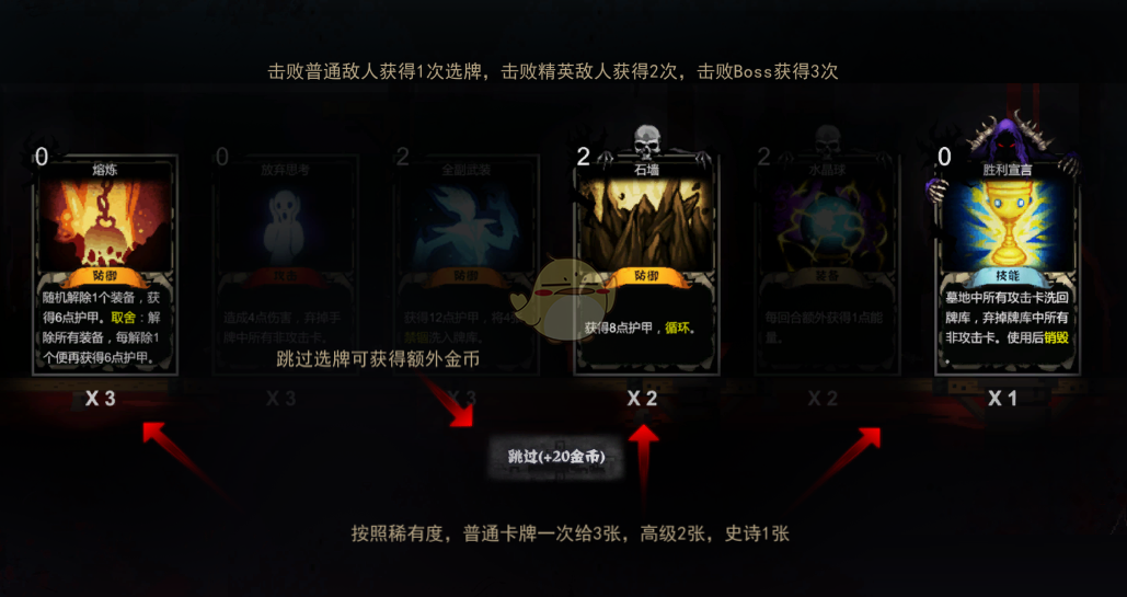 正常途径击败普通敌人可以获得1次选牌,击败精英敌人获得2次、击败BOSS获得3次,选牌时跳过的话可以获得额外金币,选择普通卡牌可以获得三张,高级卡牌两张,史诗卡牌三张。