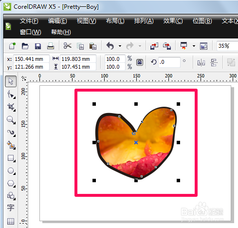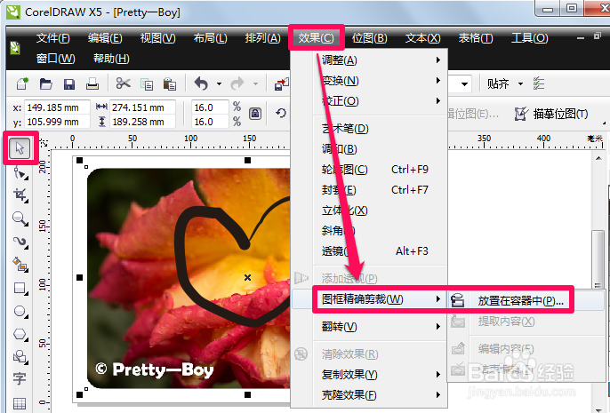3、选中您导入的图片,点击Coreldraw12菜单栏中的【效果】选项,在弹出的选项中点击【图片精确裁剪】然后选择【放置容器中】。