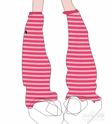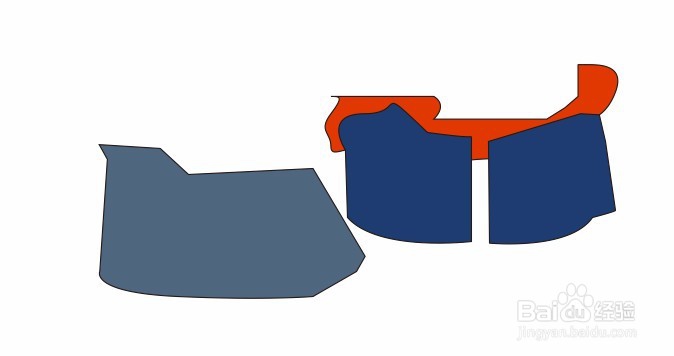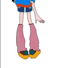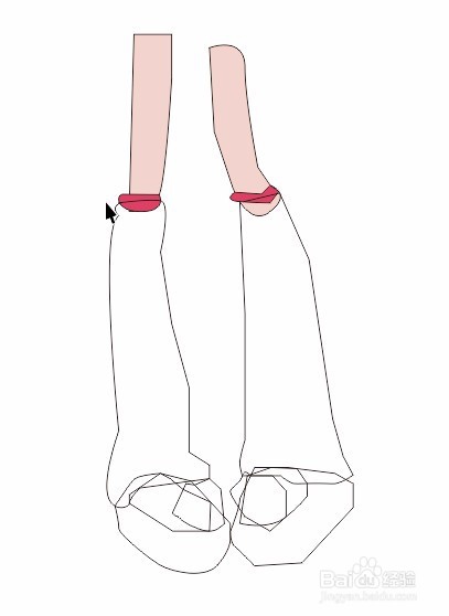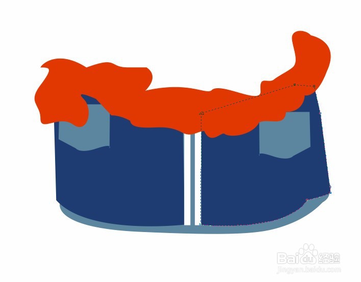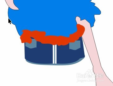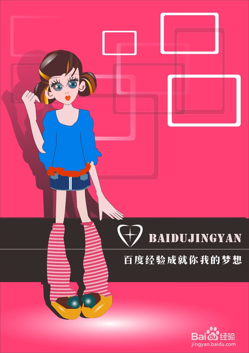 5.用贝塞尔工具绘制下半身。裙子和腿鞋子。裙子画三篇,底层一片,上面一个花的装饰。然后按ctrl+pagedown向后层移动。再画两个口袋。如图。框选全部。按F12去掉轮廓线。中间画两个矩形。如图。填充白色。去掉轮廓线。往后移一层。并调整腰花的形状。如图。转换到选择工具。全选群组。按ctrl+g;放在衣服下面。调整好大小。