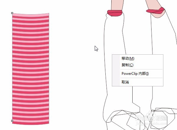 8.复制一份。将其中一份,右键拖动到需要放置的地方。在弹出的菜单中选择powerclip(图框精确裁剪)。放置完后,按ctrl键调整。完成后点右键,完成编辑。
