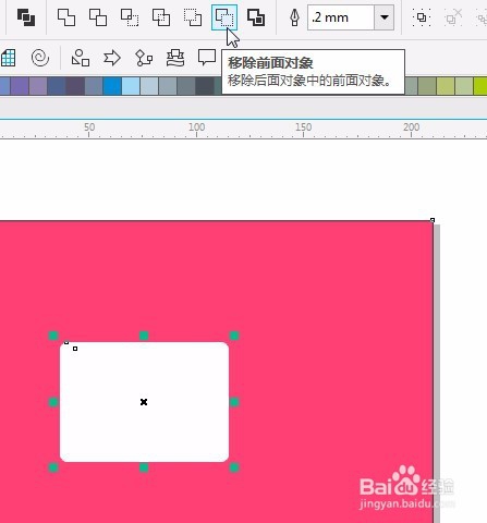 2.用矩形工具绘制圆角矩形圆角大小为3mm 填充白色,去掉轮廓线。按空格键,调到选择工具。 按住shift键。左键拖动键点击复制一个。同时选择两个图形。选择属性栏的移除前面对象。如图。复制多个。并缩小大小。如图。全选。ctrl+g群组。