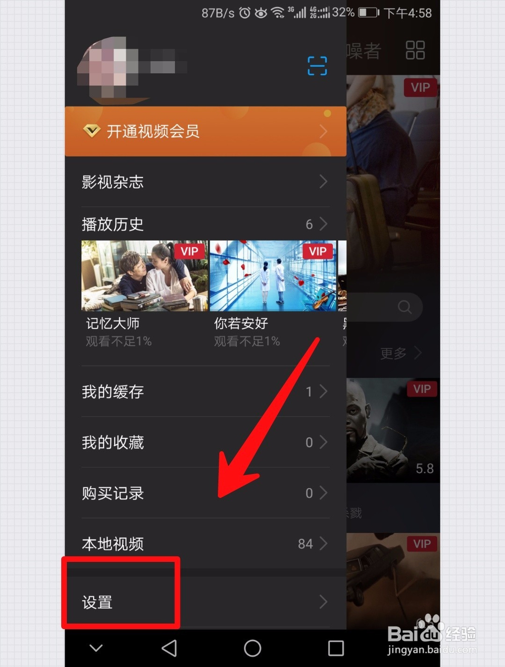 然后点击“设置”,打开设置界面;这里可以对视频封面缓存、缓存路径、跳过片头片尾进行设置