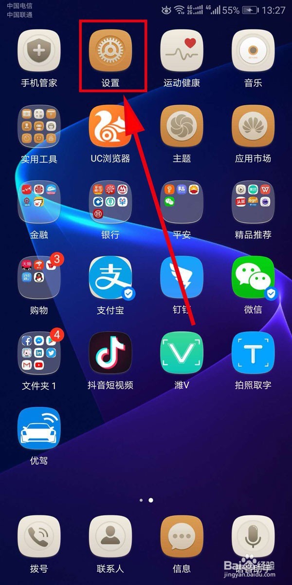 首先,华为手机和智能电视的网络必须为同一个局域网,然后,打开手机,找到“设置”,打开它