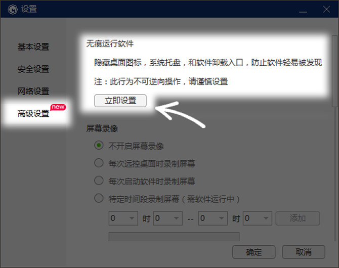 点击“高级设置”,找到无痕运行软件的相关设置,再点击“立即设置”即可。