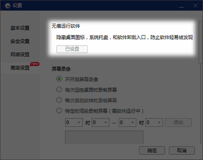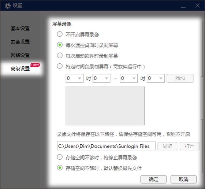 再点击“高级设置”,找到屏幕录像的相关设置,这里可以设置每次远控桌面时录制屏幕、每次启动软件时录制屏幕、特定时间段录制屏幕(需软件运行中),屏幕录像文件存储方面:可设置当存储空间不够时,停止屏幕录像,或当存储空间不够时,默认替换最先录制好的录像文件,设置完成后点击“确定”即可生效。
