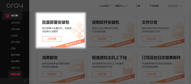 进入官网管理中心——向日葵——高级功能——批量部署安装包立即部署。