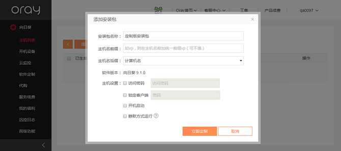 填写安装包名称、主机名前缀(选填)、主机名后缀(可选:MAC地址、计算机名、公网IP、按安装顺序数字编号)、主机设置:访问密码(需实名认证)、锁定客户端密码、开机启动、静默方式运行,设置完成后点击“立即定制”即可生成安装包。