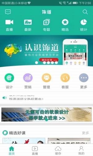 饰道app,汇集装饰行业各类名师资源,如设计大咖、工程专家、材料专家、企业管理、市场营销、供应链管理等行业资深讲师,饰道app为行业从业人员提供室内设计、工程管理、企业管理、客户服务、市场营销、企业文化、网络建设等高水平的课程。