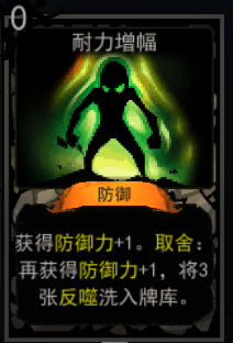 获得防御力+1。取舍:再获得防御力+1,将3张反噬洗入牌库。