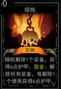 随机解除1个装备,获得6点护甲。取舍:解除所有装备,每解除1个便再获得6点护甲。
