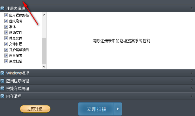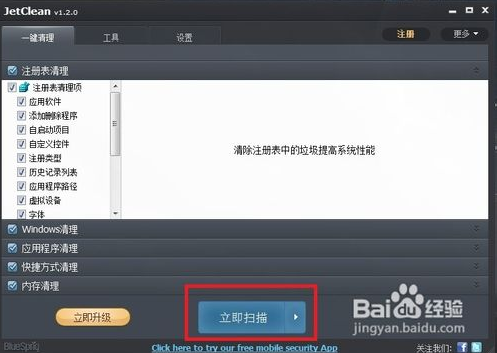 看到程序的主界面窗口,默认打开的是第一个“清理”的选项卡,JetClean默认把注册表清理等五个选项都选上了,普通用户可以不用更改直接点击“立即扫描”