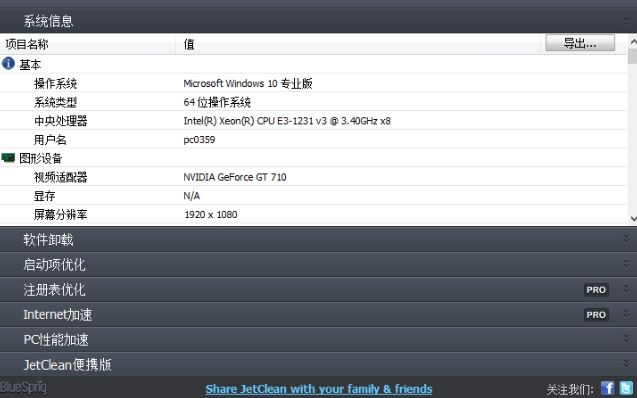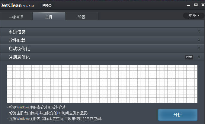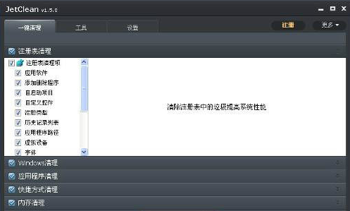 jetclean pro是一款非常好用的电脑系统清理工具,电脑用久了,由于缓存的垃圾文件将会慢慢累积。这样一来变回影响电脑的运行速度。而这款jetclean就是一款系统清理和性能优化工具。该软件不仅可以对注册表清理、Windows清理、应用程序清理、快捷方式清理和内存清理等强大的功能,而且还具备系统信息查询、软件卸载、启动项优化、注册表优化、Internet加速、PC性能加速和JetClean便携版等实用的小工具。