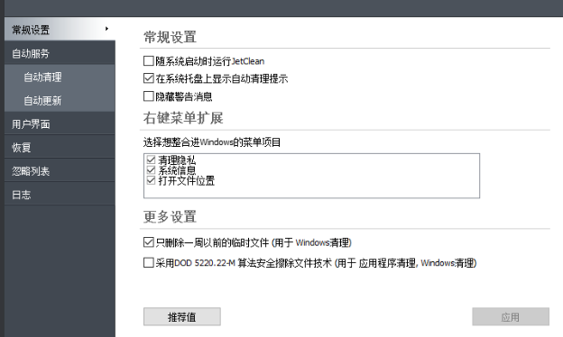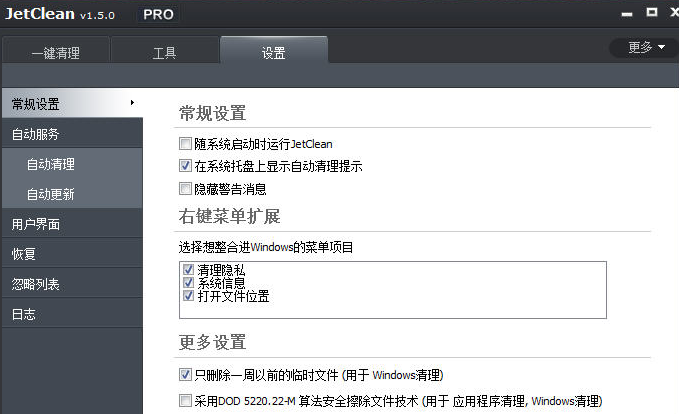 13、JetClean除了内置一键清理模块、工具模块,还内置有设置模块,该模块内提供的都是该软件的用户自定义参数设置选项。