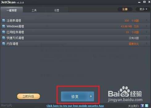等待一段时间,JetClean就会把扫描结果显示出来,我们可以点击“修复”就可以完成对扫描结果的修复和垃圾的清理了