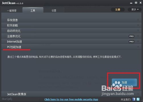 之后我们点击程序窗口上方的“工具”选项卡,选择“PC性能加速”这个选项,然后点击“加速”(免费版的JetClean注册表优化等功能有限制)