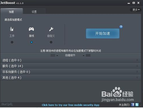 然后是选择加速模式,游戏模式的优化程度最高,但是过多的系统服务被禁用,可能会对以后造成一定的影响,所以根据自己的情况选择加速模式,选好之后点击“开始加速”,JetClean即可开始对系统的优化加速操作