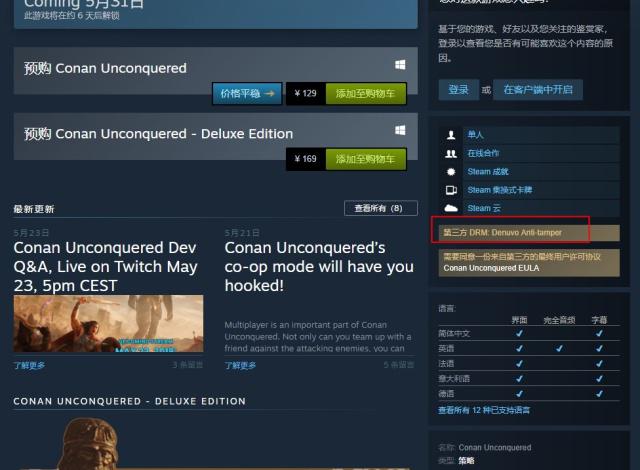 根据Steam页面,《不屈者柯南》Steam国区标准版129元,支持简体中文,采用了D加密。