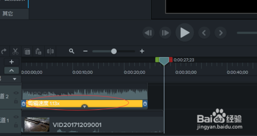 添加成功之后,在音频上会有添加效果字样,我们点击选中它,然后就可以对效果进行对应的编辑,在这里就以剪辑速度为例,我们可以拖动下面的效果条来对声音进行加速慢速处理。