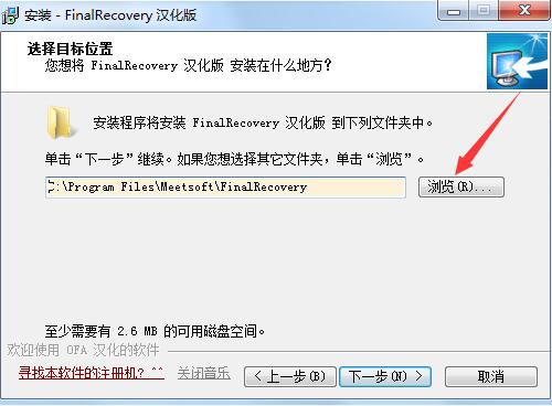 3、接下来就为finalrecovery软件选择目标位置了,默认软件安装在C盘,我们尽量选择自定义安装,单击“浏览”按钮选择一个非系统盘的文件夹然后点击确定。如下图所示: