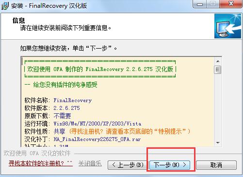 安装教程1、解压下载好finalrecovery工具的安装包,在弹出窗口中单击“下一步”。